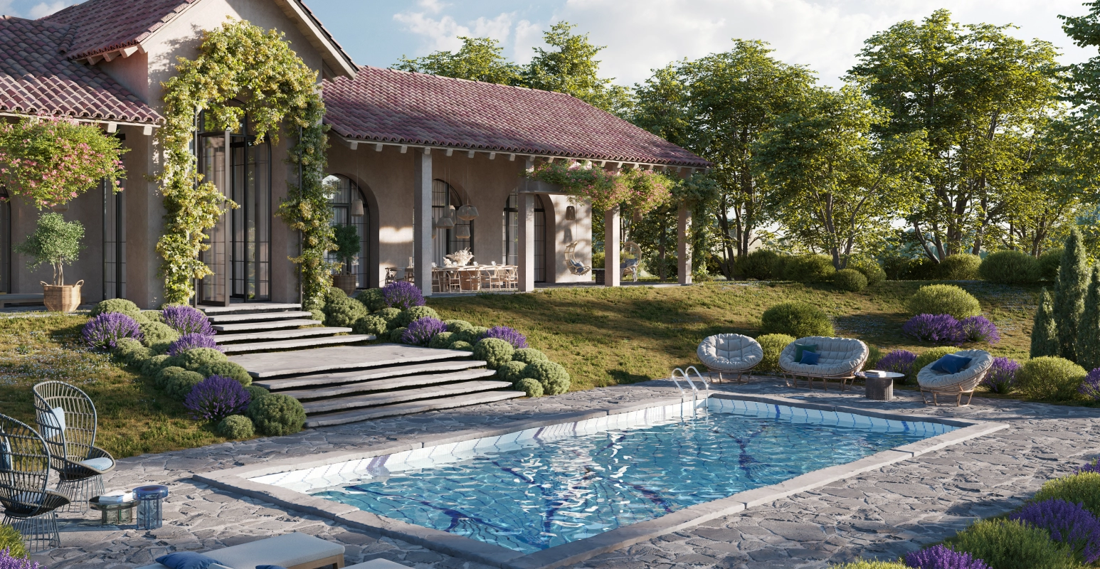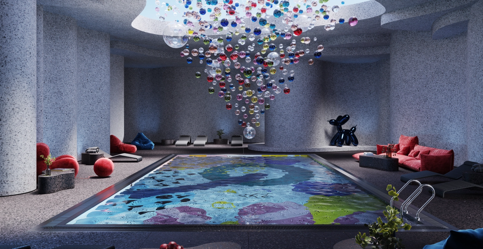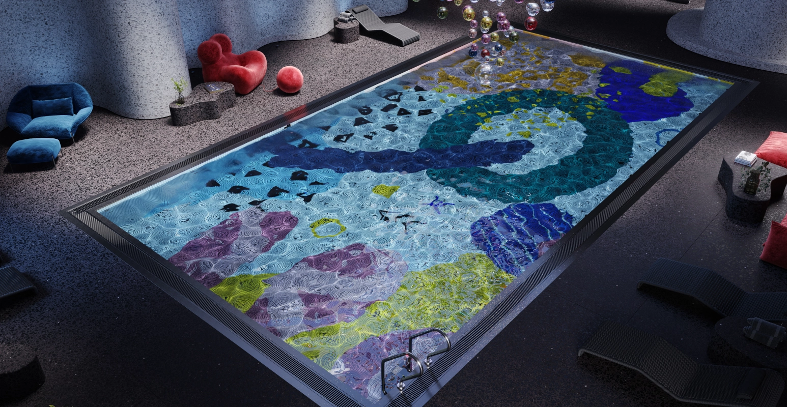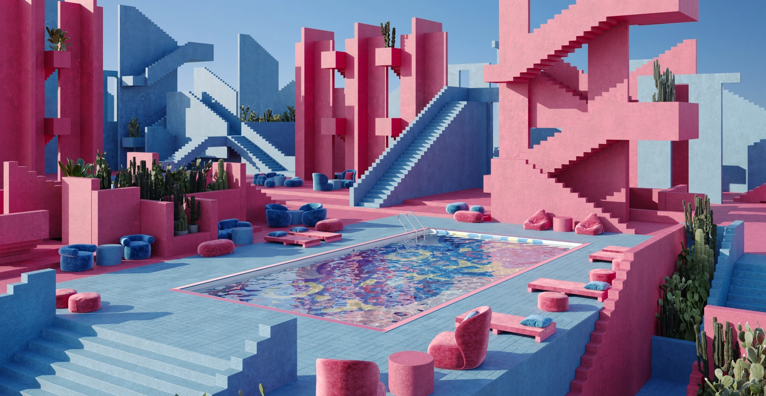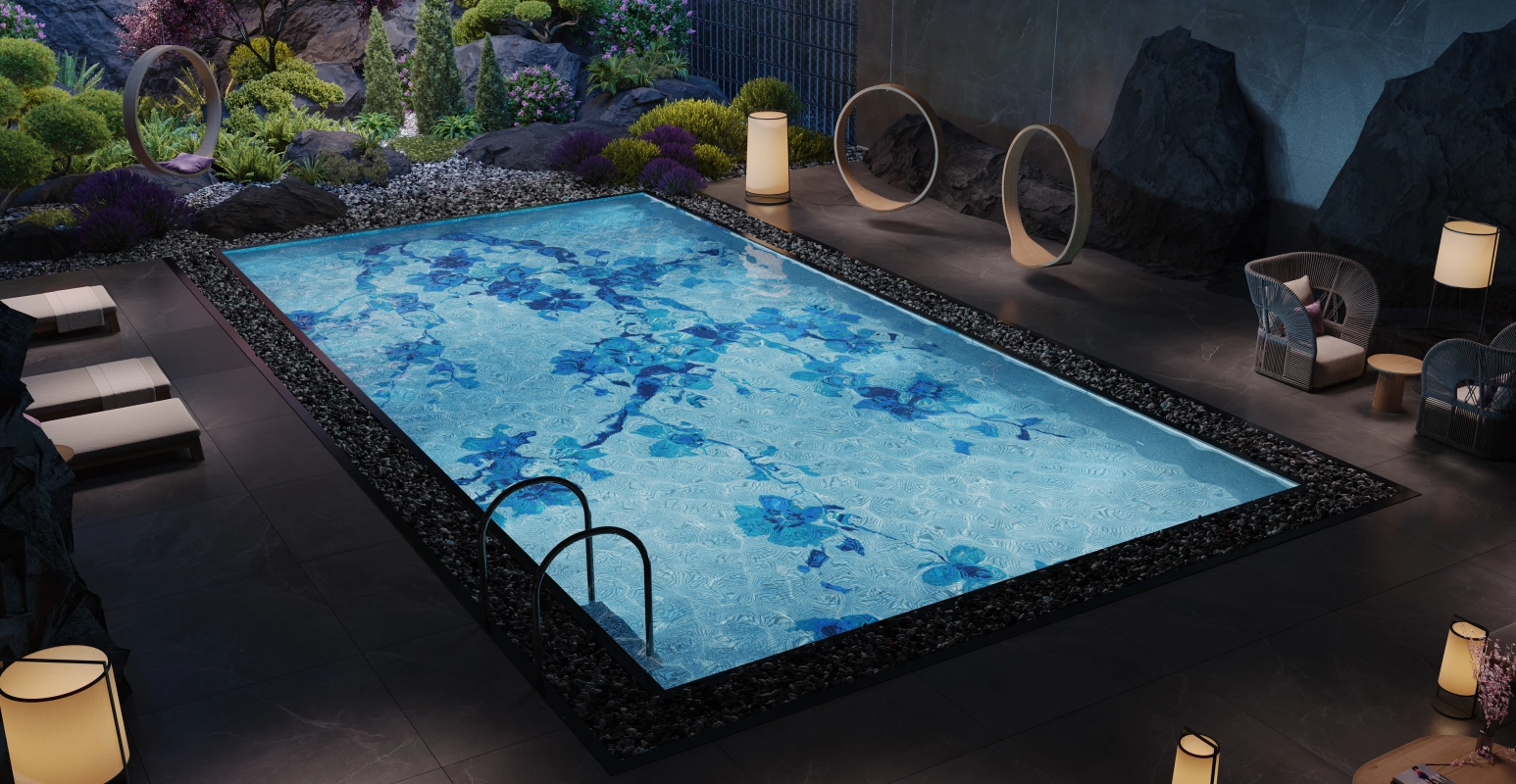 At the beginning, there were textures. Then came the mood board and the client’s approval. And so, the concepts for the environment of interesting, diverse, and colorful mosaic patterns from the Truffle collection emerged: Folds, Sakura, Cosmopolitan, and Mojito. A Tuscan villa, an underground pool with a Japanese garden in the vibe of the latest Bond movie, an abstract Escher stairway maze in the colors and architecture of Bofill, and spheres, orbs, and globules amidst terrazzo with a looming, balloon dog by Jeff Koons. This is how noise sees Truffles.